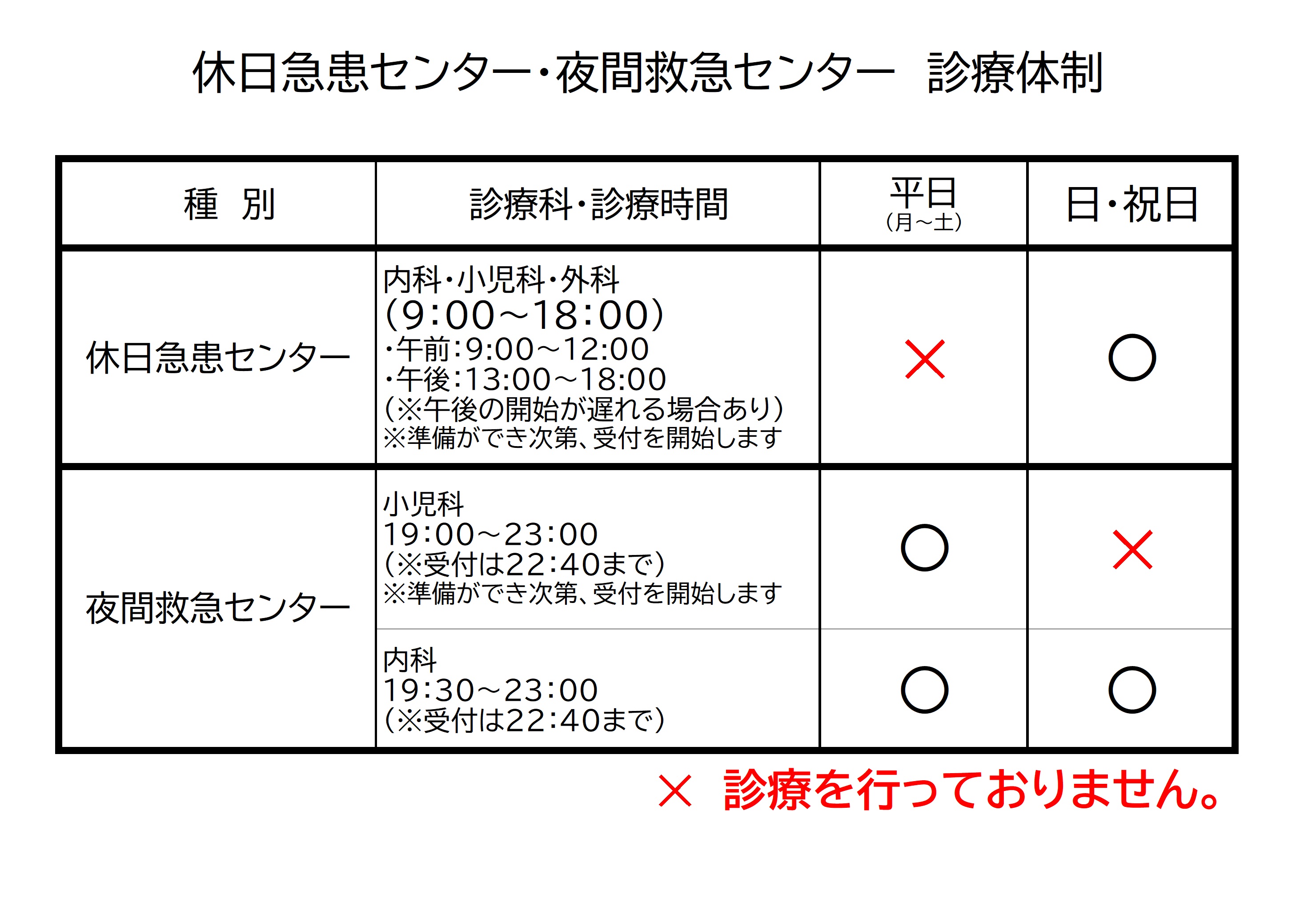 | 内科夜間救急センター | 平日(月曜~土曜) ※日曜・祝日、8/13~8/15、12/31~1/3 は休診 |