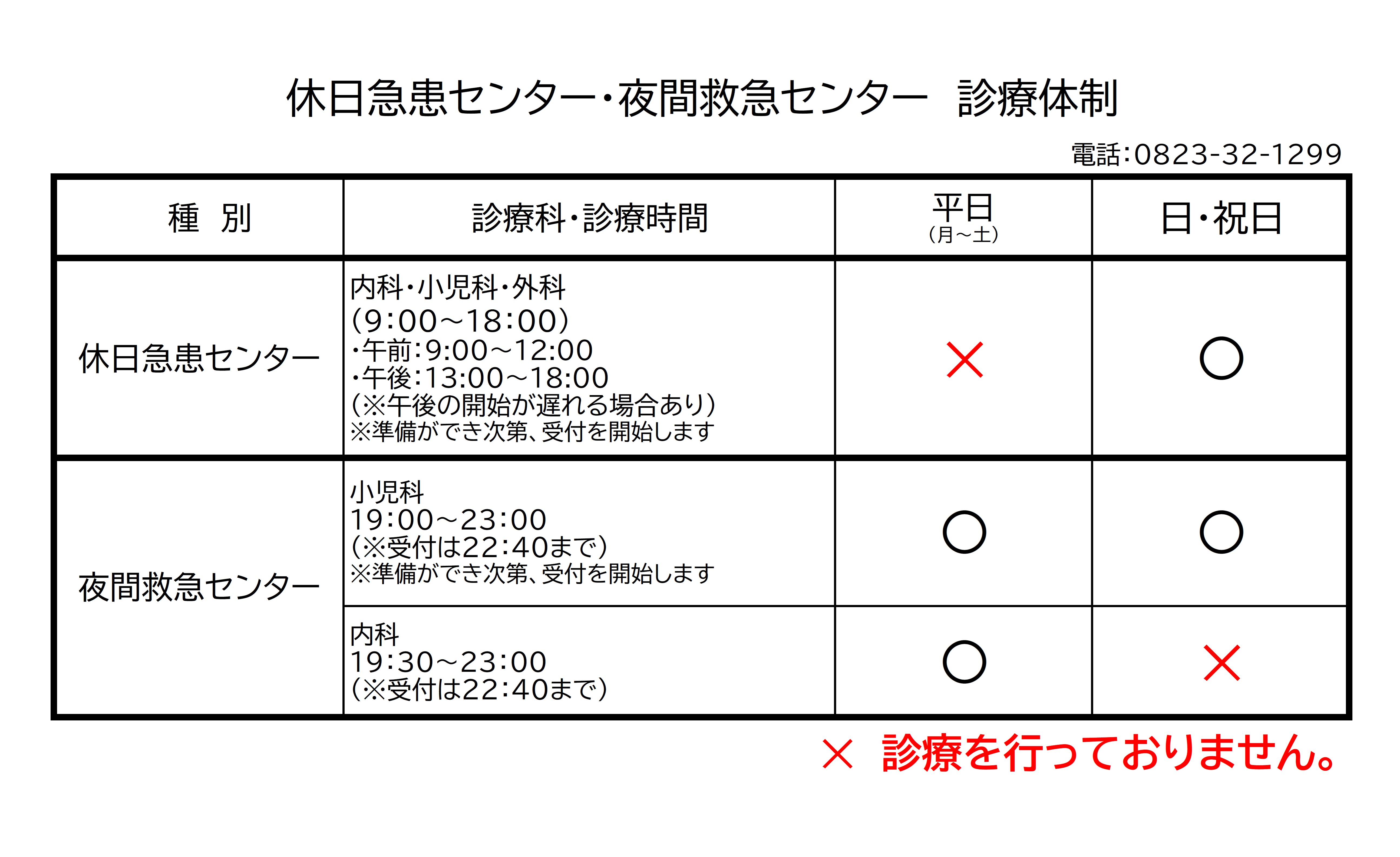※22:40~翌8:30は原則、中国労災病院(0823-72-7171)・国立病院機構呉医療センター(0823-23-1020)が交代制で診療を行ないます。